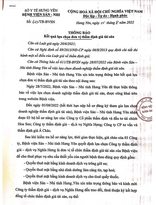 Thông tin thầu Thông báo 629/TB-BVSN ngày 05/8/2022 về kết quả lựa chọn đơn vị thẩm định giá Posted on 08/08/202225/08/2022 by benhviensannhihungyen.vn