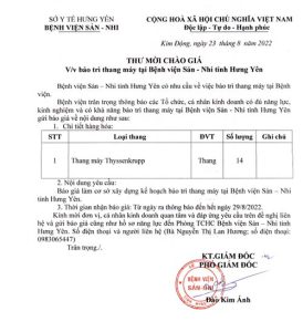 Thư mời chào giá về bảo trì thang máy tại Bệnh viện Sản – Nhi tỉnh Hưng Yên