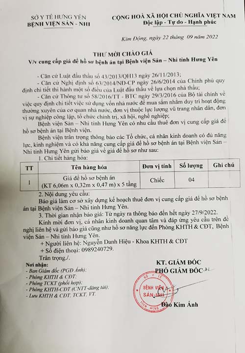 Thông tin thầu Thư mời chào giá về cung cấp giá để hồ sơ bệnh án tại bệnh viện Sản – Nhi tỉnh Hưng Yên Posted on 22/09/2022 by benhviensannhihungyen.vn