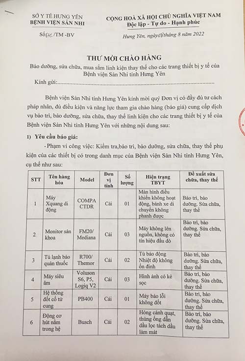 Thông tin thầu Thư mời chào hàng bảo dưỡng, sửa chữa, mua sắm linh kiện thay thế cho các trang thiết bị y tế của Bệnh viện Sản Nhi tỉnh Hưng Yên Posted on 09/08/202225/08/2022 by benhviensannhihungyen.vn